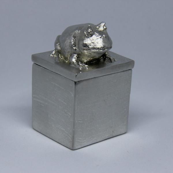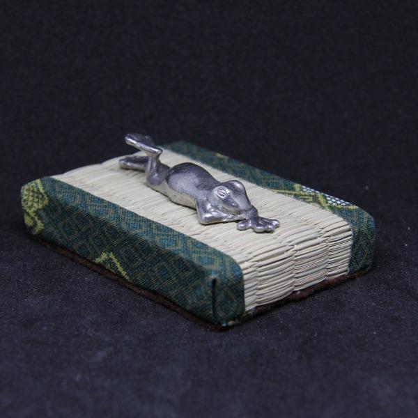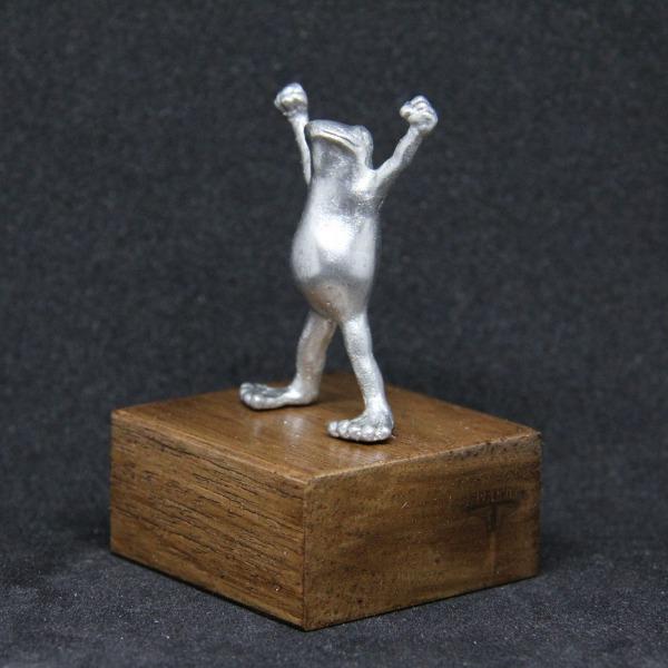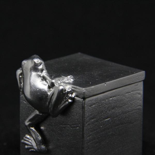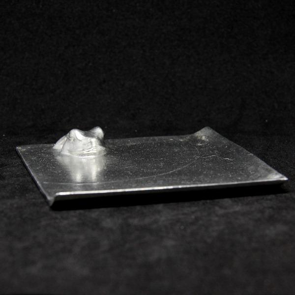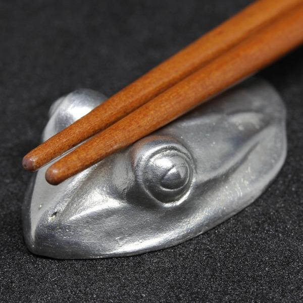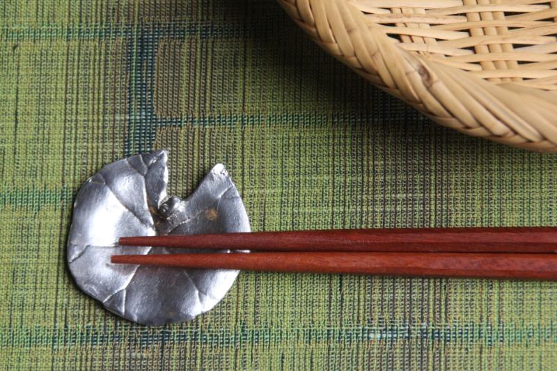 ドクダミの葉の上に座るヌマガエルがモチーフの錫製箸置きです。