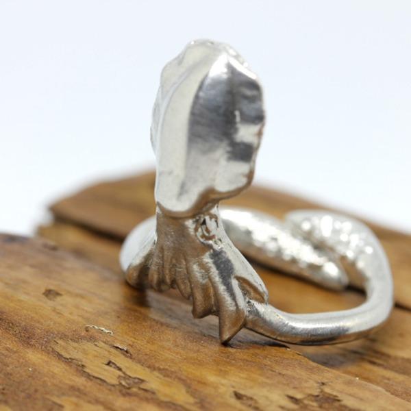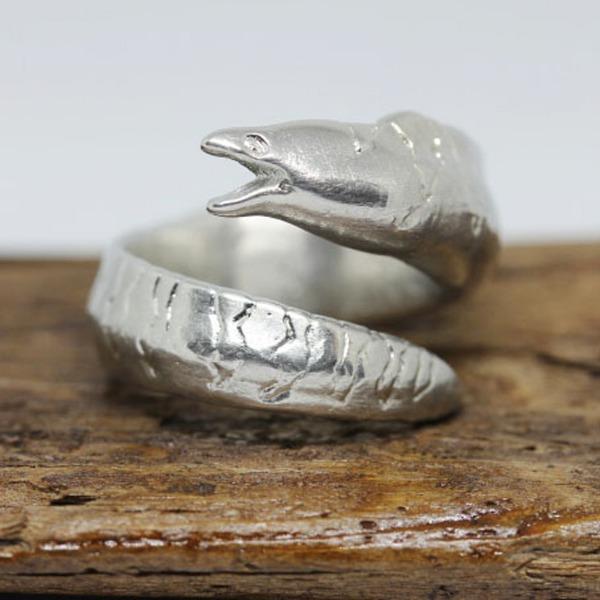 獰猛な性質を持ちながらも、どこか可愛げのある表情が特徴の、ウツボをモチーフにした錫製のリングです。