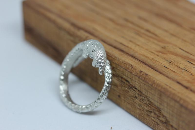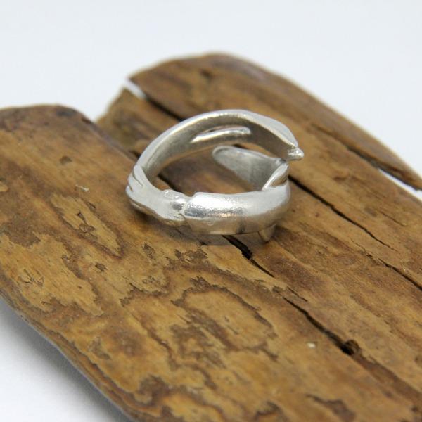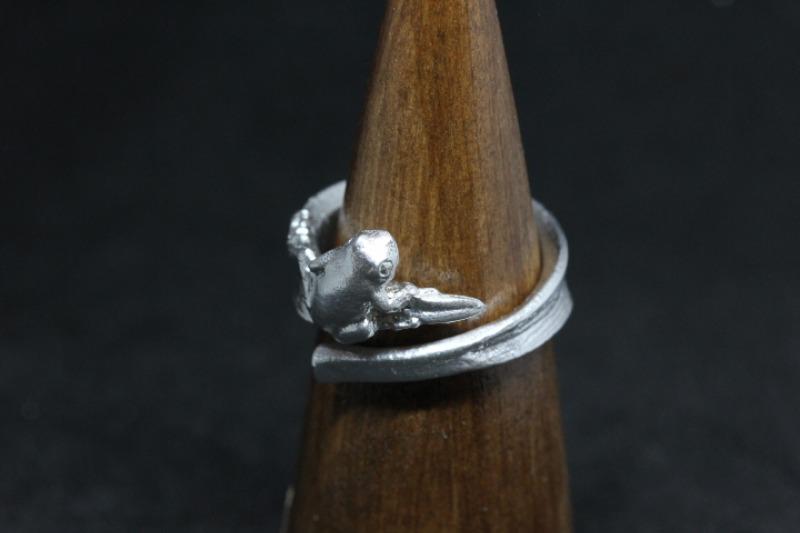 二本の触腕で指先に抱きつくアオリイカをモチーフにした錫製のリングです。