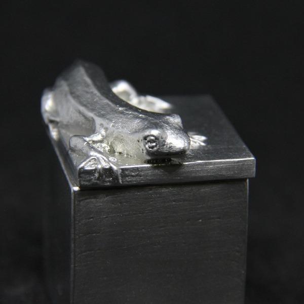 オオサンショウウオがのったりと横たわった錫製の小皿です。