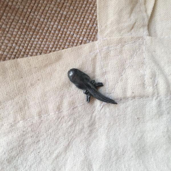後ろ足が生えた成長中のオタマジャクシをモチーフにピンバッジを作りました。