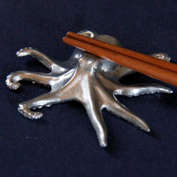 足を広げたマダコをモチーフにした箸置きです。お箸を乗せられて、頭(頭ではないですが)がブニッとつぶれたデザインになっています。