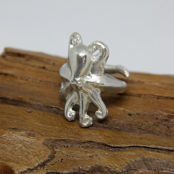 体全体を使って指に巻き付くケンサキイカの錫製リングです。