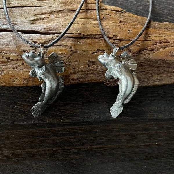 干潟で飛び跳ねて求愛行動をするムツゴロウがモチーフのピューター製ペンダントです。