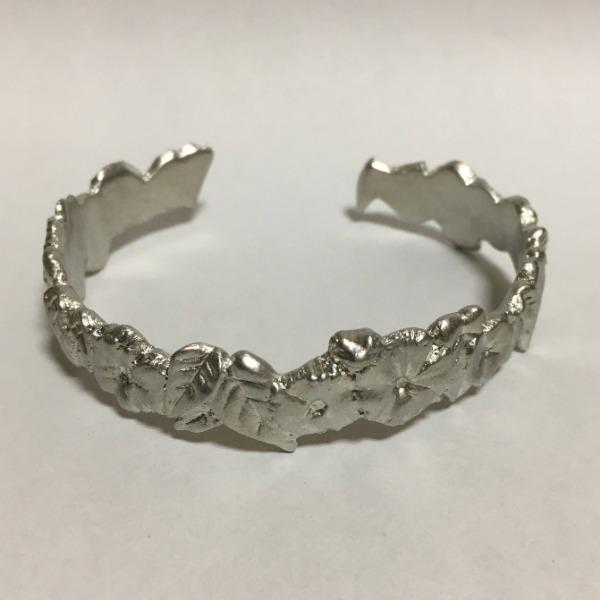 葉っぱの陰から顔をのぞかせる蛙をあしらった錫製のバングルです。