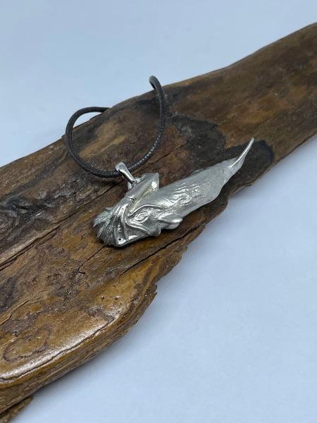 大きな背びれと鋭い歯が特徴のミズウオをモチーフにしたピューター製ペンダントです。