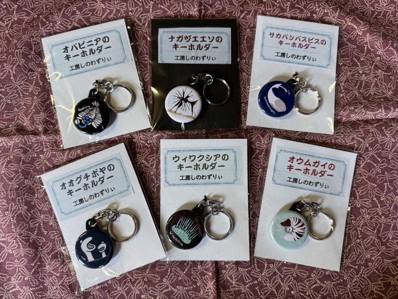 アニマロカリス、ハルキゲニア、ウィワクシア、オパビニア、オットイア、ルナタスピス、サカバンバスピスの7種の缶バッジ。