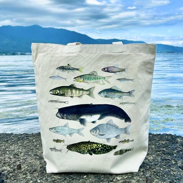 これまで描いてきた琵琶湖の魚たちをできるだけ詰め込んだトートバッグです。ビワコオオナマズやビワヨシノボリなどの琵琶湖固有の魚と、私が琵琶湖流入河川で採集したハスを入れております。