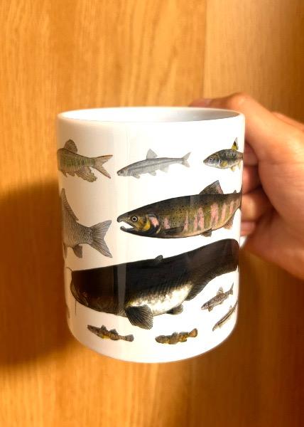 色鉛筆で描いた琵琶湖の魚たちを詰め込んだマグカップです。
