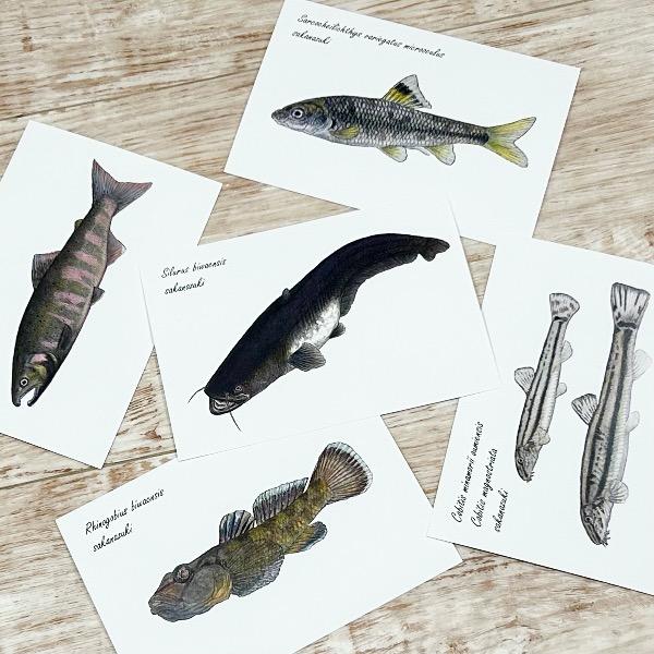 色鉛筆で描いた琵琶湖の魚たちのポストカード5枚セットです。
