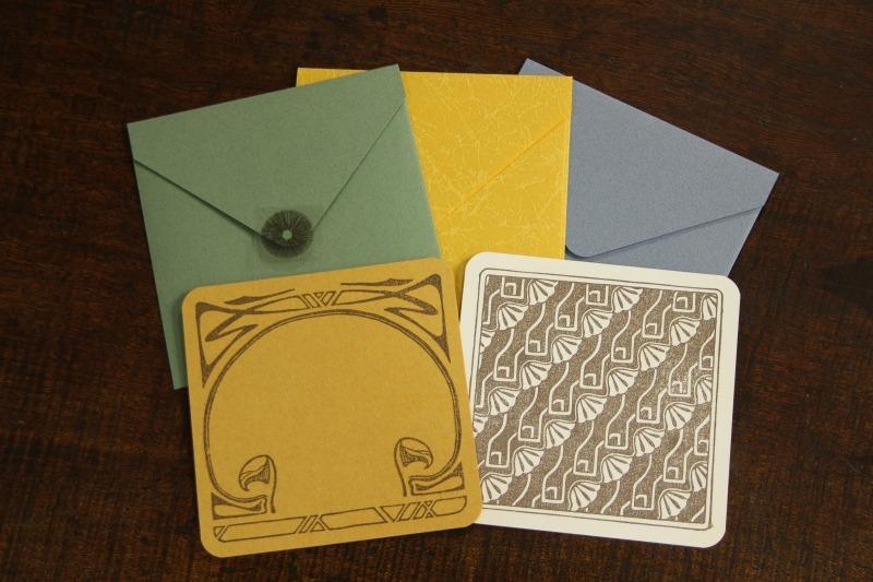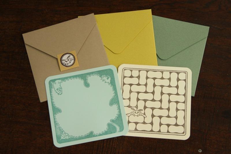 消しゴムはんこを捺して作ったグリーティングカードです。表はツクリタケ(マッシュルーム)、裏はスジオチバタケをあしらいました。サイズは封筒が10cm角です。
