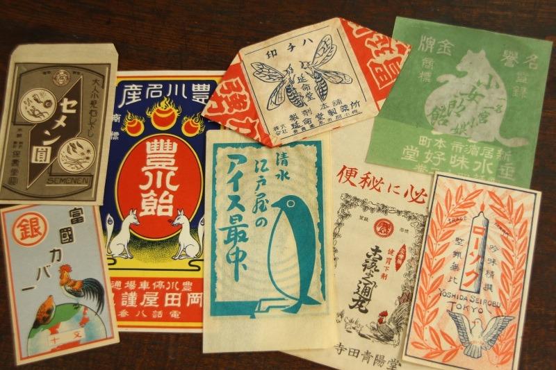 だいたい昭和初期~戦後すぐくらいに作られた、さまざまな商品のパッケージ。お菓子や薬の袋が多いです。