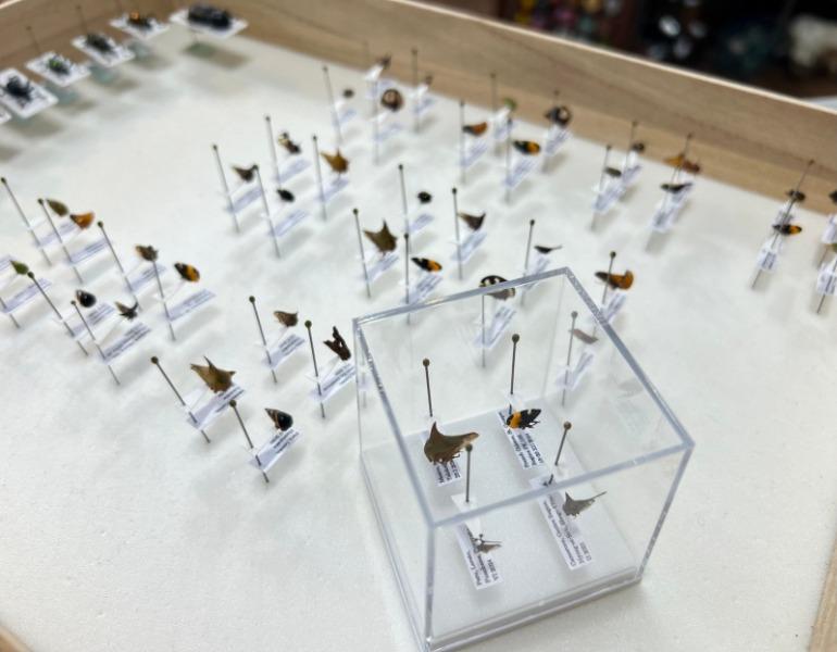 世界の美麗・珍奇な昆虫をたくさん並べます。虫好きの店主がこだわりをもって製作した高品質な標本です。化石や鉱物も少々。