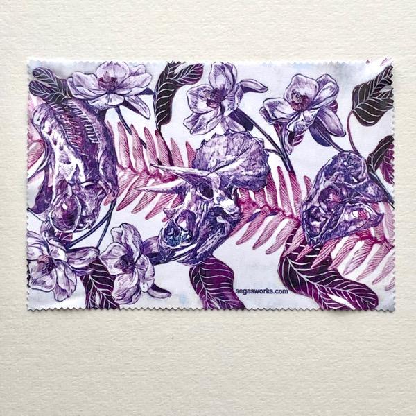 アーケアンサスと恐竜の頭の骨をパターンにしてメガネ拭きにプリントしました。こちらは真ん中にトリケラトプスの頭骨があります。