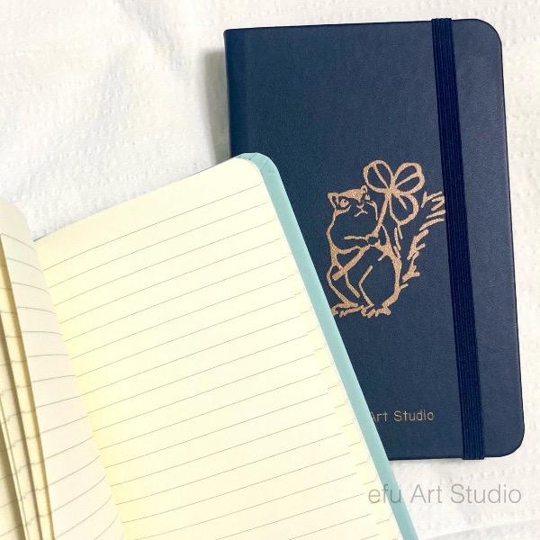 片手で持てるサイズのハードカバーノートに明るいブラウンでリスの絵柄をプリントしました。