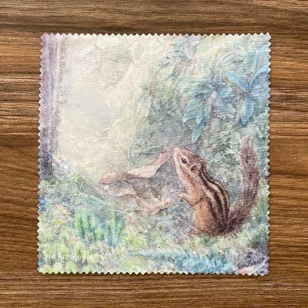 木漏れ日の森のにいるシマリスの絵をプリントしたメガネ拭きです。