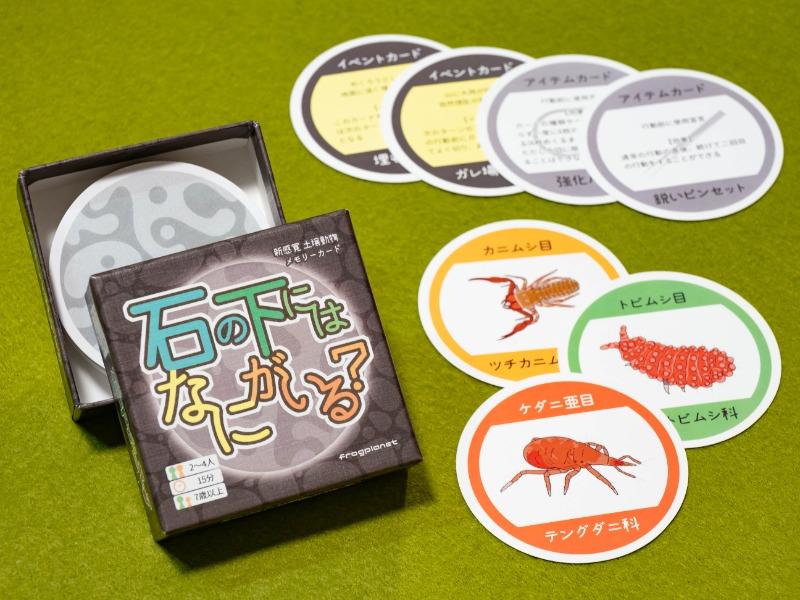 土壌動物メモリーカードゲーム。石を模した円形カードで絵合わせをします。同じ土壌動物がそろったら採集!一番多くの土壌動物を集めて、石めくりマスターになろう!アイテムを駆使して有利にゲームを進めよう!