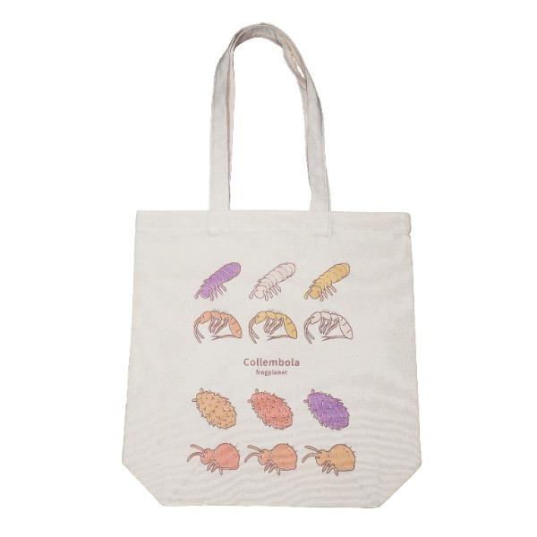 庭の土や森の落ち葉、水辺などあらゆる場所に生息する1mm前後の小さな生き物、トビムシ。赤色、黄色、紫色など...カラフルで多様なトビムシたちを描いたトートバッグです。
