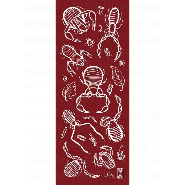落ち葉の下や樹皮の隙間、海辺にまで実は色々な場所に潜む土壌動物の一種、カニムシ。カニムシや同環境に生息する生き物を描いた手ぬぐいです。