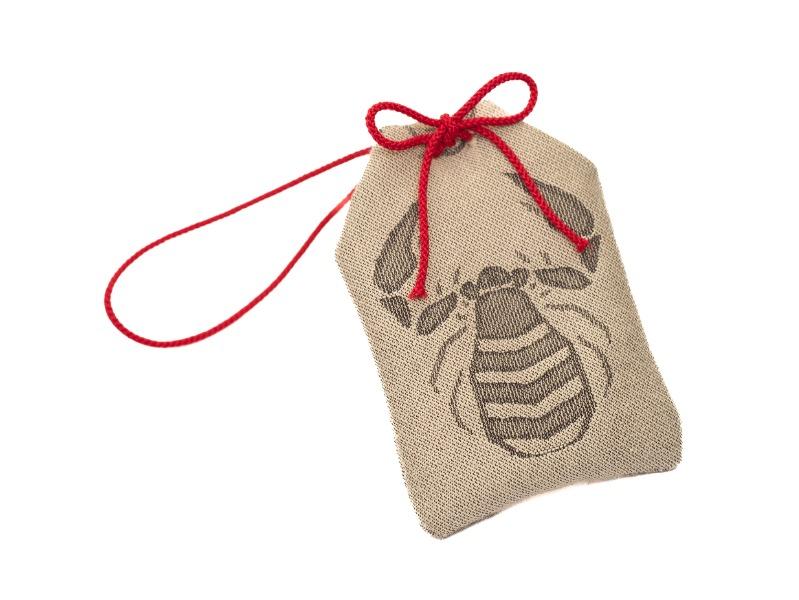 カニムシの柄のオリジナル織物から作ったお守り袋です。
