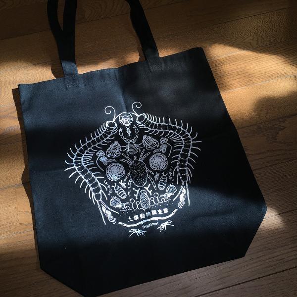 ダンゴムシ、ムカデ、ダニ、ミミズ、トビムシ...多様な土壌動物でエンブレム風のイラストを描いたトートバッグです。