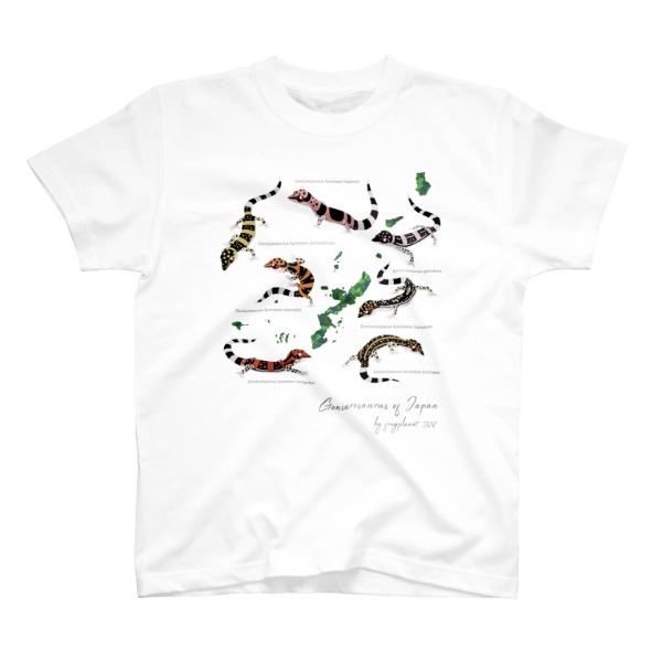 沖縄県や鹿児島県の一部に生息する美しい爬虫類、トカゲモドキをデフォルメし、彼らが分布する島嶼部の地図と共に描いたイラストのTシャツです。