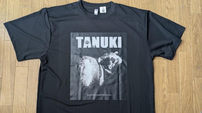 柿をムシャクシャしている時に撮ったパンクでロックな表情のタヌキが印刷されたTシャツ。ドライ仕様です。